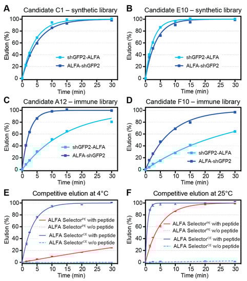 For an estimation of the off-rates for ALFA SelectorPE and analogous resins coupled to NbALFACE candidates, 20 µL of substrate-saturated resin was washed four times with PBS and resuspended in 200 µL of PBS containing 200 µM ALFA peptide. At given time points, the progression of elution was quantified by measuring the fluorescence of the GFP-tagged protein released into the supernatant (QBit 3.0; Thermo-Fischer Scientific, Waltham, MA, USA). After the kinetic measurements, all reactions were adjusted to 200 µM peptide concentrations and incubated for 30 min at 30 °C. The fluorescence values obtained after such post-elution were set to 100%. For the experiments shown in Figure 2E,F, each data point represents the average of four independent experiments performed in parallel. The statistical analyses and curve fittings were performed using GraphPad Prism 5.0.