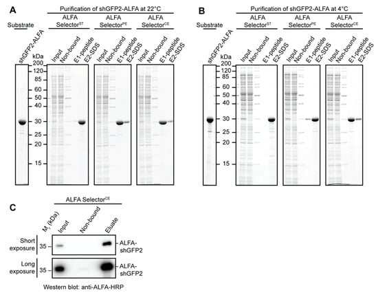 We next wanted to compare the features of the well-characterized high-affinity ALFA SelectorST and intermediate-affinity ALFA SelectorPE [] with the novel ALFA SelectorCE in single-step affinity purification experiments using shGFP2-ALFA at 22 and 4 °C (Figure 3A,B). As expected, all the resins specifically bound the ALFA-tagged target protein at both temperatures with comparable capacity. Consistent with our previous observations [], the competitive peptide elution from ALFA SelectorST was generally inefficient at all the tested temperatures. Thus, the bound proteins had to be post-eluted with SDS sample buffer (Figure 3A,B, left panel). By contrast, the bound target protein could be efficiently released by peptide elution under native conditions at 22 °C from both ALFA SelectorPE and ALFA SelectorCE (Figure 3A,B, middle and right panels). When comparing the efficiency of peptide elution at 4 °C, differences became apparent between ALFA SelectorPE and ALFA SelectorCE: while the peptide elution from ALFA SelectorPE was inefficient, the target protein was readily released from ALFA SelectorCE under identical conditions (Figure 3B, middle and right panels).