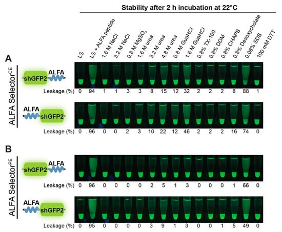 A volume of 20 µL of ALFA SelectorPE or ALFA SelectorCE was saturated with either ALFA-shGFP2 or shGFP2-ALFA. The beads were washed four times with Tris-buffered saline (TBS: 25 mM Tris/HCl, pH 7.5; 150 mM NaCl; 2 mM EDTA) and subsequently incubated in 200 µL of the indicated solutions or buffers for 2 h at room temperature with shaking. For post-elution, 250 µM ALFA peptide was added, and the reactions were further incubated for 30 min at 25 °C. The eluates were quantified using a fluorometer (QBit 3.0; Thermo-Fischer Scientific, Waltham, MA, USA) before and after post-elution with ALFA peptide. Pictures were taken upon UV illumination using a Nikon D700 camera equipped with a 105 mm macro lens (Nikon, Minato, Japan).