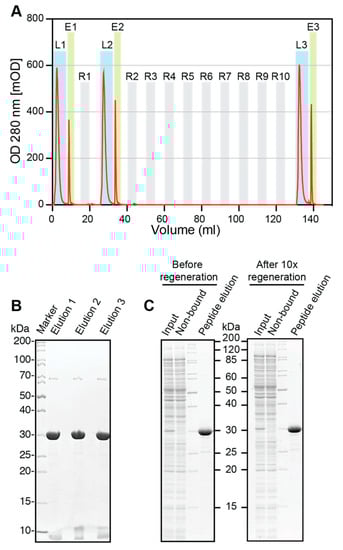 Regeneration of ALFA SelectorCE under acidic conditions. (A): 0.5 mL of ALFA SelectorCE was subjected to a first cycle of loading with ALFA-shGFP2 (L1) and competitive peptide elution (E1). The column was regenerated under acidic conditions using 100 mM glycine and 150 mM NaCl at pH 2.2 (R1) and re-equilibrated with PBS before starting a second cycle of loading and elution (L2 and E2). After 9 additional repeated regeneration/re-equilibration steps (R2–R10), the column was loaded and eluted a third time (L3, E3). The whole procedure was followed by recording the optical density at 280 nm (OD280; red curves). (B): Fractions for each elution step were collected, quantified and analyzed by SDS-PAGE and Coomassie staining. (C): Effect of regeneration on nonspecific background binding. Single-step affinity purification from E. coli lysate blended with shGFP2-ALFA was performed using ALFA SelectorCE either before regeneration or after 10 cycles of regeneration with glycine, pH 2.2 (left and right panels, respectively). The experiment was essentially performed as described for Figure 3A,B.