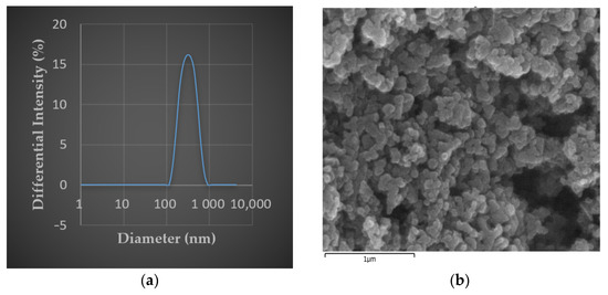 Physical and chemical information on the diesel exhaust particulates (DEP). (a) The size distribution of DEP in the cell culture medium, average diameter of 284.2 nm; (b) SEM image of DEP (magnification of 40,000×).