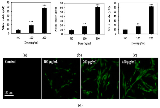 Diesel exhaust particle-induced NO/reactive oxygen species (ROS) production. Changes in nitric oxide levels, after exposure to DEP (0–200 μg/mL) for (a) 24 h, (b) 48 h, and (c) 72 h in WI-38 cells. Statistically significant difference is indicated by ** p < 0.01 and *** p < 0.001 when compared with the negative control. Values are means of triplicate measurements. NC: negative control. Intracellular ROS production following treatment with DEP (d). Incubation with various concentrations of DEP (100–400 μg/mL) increased intracellular ROS production. Scale bar = 150 μm.