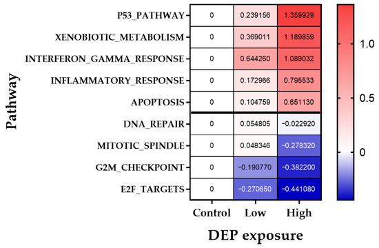 We further identified the dose-dependent relationship for the effect of DEP on gene expression data. We further confirmed the dose dependence of DEP exposure effect on the gene expression profile. In WI-38 cells, after 24 h of exposure to 100 and 200 μg/mL of DEP, the expression of gene set of genotoxic stress-related hallmark pathway including p53, xenobiotic metabolism, inflammatory response, DNA repair, and G2-M DNA damage checkpoints was amplified (Figure 6).