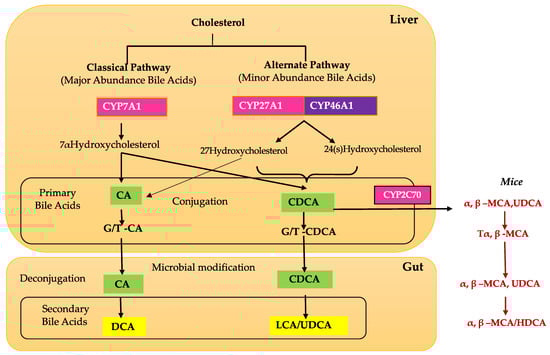 The alternate pathway is initiated by sterol 27-hydroxylase (CYP27A1), a mitochondrial cytochrome P450 enzyme that is widely distributed in macrophages and most tissues [,,]. Studies have shown that the alternative pathway contributes to around 9% of total BA synthesis in human hepatocytes []. Initiation by CYP27A1, followed by CYP7B1 (25-hydroxycholesterol 7-alpha-hydroxylase), leads to the synthesis of CA and CDCA in the liver and extrahepatic tissues such as steroidogenic tissues and macrophages [,].