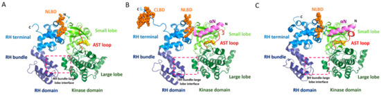 Like PKA, the GRK kinase domain consists of small and large lobes. The ATP-binding site is found in a deep crevice formed at their interface, whereas peptide substrates are presumed to bind to the large lobe. They feature an AST loop [55] that, in PKA and other AGC kinases, is disordered until the kinase adopts an active configuration. Unlike PKA, GRKs do not require phosphorylation of their so-called activation loops to help them assemble into an active form, and they contain accessory structural elements, including the RH domain [56] and a ~20 amino acid N-terminal helical region known to be essential for receptor phosphorylation [36,54,57,58,59,60,61,62].