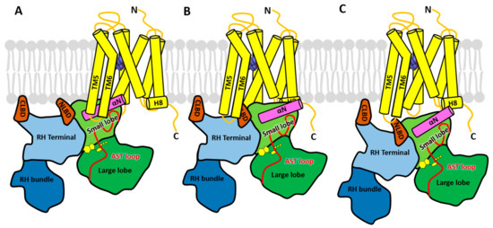 Ever since GRKs were identified as key regulators of active GPCRs, investigators have sought to determine which structural features on GRKs are used to discriminate between the agonist-free and agonist-bound states of GPCRs and how binding to agonist-bound GPCRs enhances the catalytic activity of the GRK [24,25,26,27,28]. It was also established early on that activated GPCRs are allosteric activators of GRKs, based in part upon the observation that activated receptors with no phosphosites can increase the GRK catalytic efficiency towards soluble peptide substrates [28,29], consistent with stabilization of a more catalytically competent state of the enzyme. However, despite a wealth of molecular information from high-resolution crystal structures of five of the seven human GRKs [30,31,32,33,34], the mechanism by which the kinase domain transitions from an inactive to an active state has remained elusive. This is because the N-terminus and active site tether (AST) regions of GRKs, which have long been postulated to play a role in the allosteric activation of GRKs, are typically disordered or adopt inconsistent conformations among the available structures, in part due to interactions mediated by crystal contacts. This behavior also reflects the fact that, with a few notable exceptions, the kinase domains in these structures do not adopt a fully closed conformation, at least based on a comparison to the transition state complex of protein kinase A (PKA) [35], a closely related and well-characterized member of the AGC kinase family to which GRKs belong (Figure 1A). The exceptions are a structure of GRK6 bound to an adenosine analog sangivamycin [36] and the recently reported structure of GRK5 in complex with Ca2+·calmodulin (Ca2+·CaM) [37]. In these models, the kinase domain, N-terminal helix, and AST adopt similar configurations (Figure 1B,C). In the first case, the assembly seems to be stabilized by interactions between the N-terminal helix with a fortuitous crystal contact and, in the latter case, by Ca2+·CaM. Thus, whatever the mechanism of GPCR-mediated GRK activation, it seems likely that it induces a kinase domain conformation similar to those exhibited by these two structures.