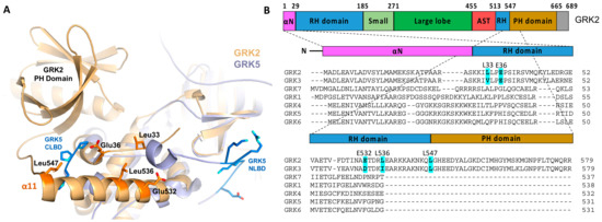 - Lodowski, D.T.; Tesmer, V.M.; Benovic, J.L.; Tesmer, J.J. The structure of G protein-coupled receptor kinase (GRK)-6 defines a second lineage of GRKs. J. Biol. Chem. 2006, 281, 16785–16793. [Google Scholar] [CrossRef] [PubMed]
