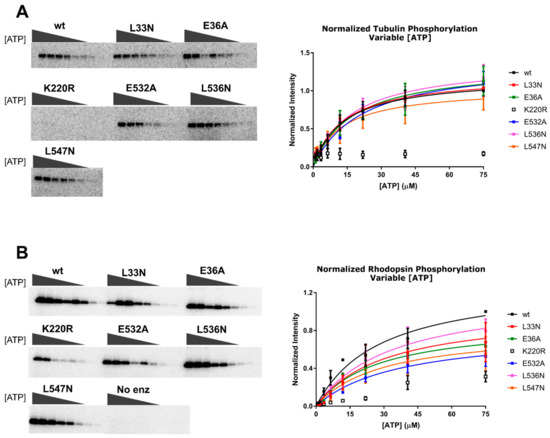 We hypothesized that there would be no change in the Km values or normalized Vmax for tubulin phosphorylation, because we did not expect these mutations would affect the binding kinetics of ATP or the ability of the kinase domain to adopt a closed state in the absence of a receptor. Similarly, we did not expect changes in the Km for rhodopsin phosphorylation when ATP was varied, but changes in the normalized Vmax for rhodopsin could be indicative of a receptor binding defect. However, we only observed small changes in the Km, normalized Vmax, or normalized Vmax/Km (henceforth referred to as “normalized catalytic efficiency”) using either tubulin or rhodopsin (Figure 4 and Table 1 and Table 2). The biggest differences were in the normalized Vmax data while varying rhodopsin concentration, but even so, the effects were less than two-fold.
