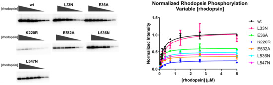 A Michaelis–Menten analysis was also performed by varying the concentration of rhodopsin in ROS with a fixed concentration of ATP (Figure 5). Here, variants with receptor binding effects would be expected to increase the Km. However, there was no significant difference in the Km for rhodopsin among any of the variants. We did observe statistically significant decreases in normalized Vmax for all of the variants except L33N, but none of these variants exhibited significant differences in the normalized catalytic efficiency (Table 3). It is therefore likely that these differences could be due to differences in the specific activity towards rhodopsin among the purified variants. Notably, we previously prepared the E36A variant in the background of untagged GRK2 expressed in COS-1 lysates and, consistent with this work, the mutant retained >85% of WT phosphorylation activity when using 10-µM rhodopsin as a substrate [42].