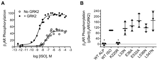 To test these variants against a hormone responsive GPCR, we assessed their ability to phosphorylate the β2AR in COS-7 cells [52]. In a previous work, we found that at the isoproterenol (ISO) concentration commonly used to stimulate the β2AR in desensitization assays (10 µM) transfection of GRK2 only stimulated WT β2AR phosphorylation 40% [54]. In that work, we utilized the β2AR-Y326A variant, which is not phosphorylated by endogenous COS-7 cell kinases and therefore allowed the measurement of β2AR phosphorylation by transfected GRK2 [74,75]. For this work, we further adapted the assay to allow the measurement of WT β2AR phosphorylation by transfected GRK2. To optimize the agonist- and GRK2-dependent phosphorylation of WT β2AR, we measured its phosphorylation as a function of the ISO concentration in the absence and presence of transfected GRK2. The EC50 values for the phosphorylation of β2AR were 51 and 2.5 nM, respectively, in the absence and presence of transfected GRK2 (Figure 6A). The increase in ISO potency due to GRK2 was surprising but could be attributed either to an allosteric effect on the β2AR by the RH, kinase, or PH domains of GRK2 or to a phosphorylation event that directly or indirectly impacts the conformation of β2AR. Similar results have been observed for the μ-opioid receptor using arrestin recruitment assays as an indirect measure of GRK2 function. In cells stably or transiently transfected with the μ-opioid receptor, the transfection with GRK2 increased the potency of six agonists 10- to 44-fold (average of 28-fold) in β-arrestin1 (arrestin2) [76] or β-arrestin2 (arrestin3) [77] BRET recruitment assays. However, the CRISPR knockout of GRK2 in HEK293 cells diminished the maximum signal, but not the potency of agonist-induced recruitment to the μ-opioid receptor in a β-arrestin1 (arrestin2) BRET recruitment assay [78]. In combination, these results suggest that the potency-increasing effects of GRK2 might occur only in tissues such as the brain where the GRK2 expression level is high. The level of GRK2 in the rat cerebellum and cortex is similar to the level found in transfected cells [65].