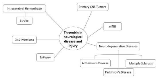 Relevance of thrombin to neurological disease and injury. The role of thrombin in epilepsy, CNS infections, mild traumatic brain injury, neurodegenerative diseases, stroke, and primary CNS tumors continues to be investigated.