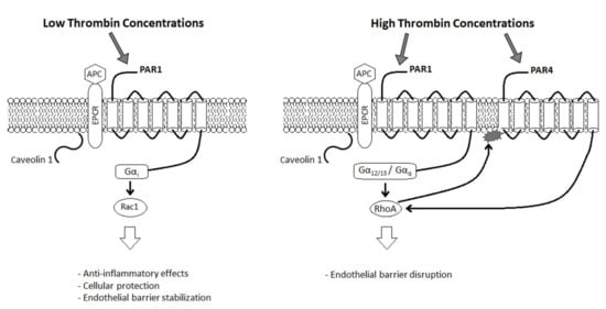 Thrombin is involved in cell protection and induces apoptosis through the activation of PAR1 via the guanosine triphosphate binding protein RhoA and the protein kinase C pathway [11,46,47]. PAR1 is activated via cleavage by thrombin into tethered activation peptide ligands that enable transmembrane signaling [48]. After cleavage, some PAR1 receptors are internalized, while approximately 20–60% remain on the cell surface [49]. The activity of thrombin depends on thrombin concentration and length of exposure of thrombin to the cellular environment (Figure 2). PAR1 receptors are cleaved more rapidly at high thrombin concentrations, enabling a greater cellular response [49]. Short exposure to low thrombin concentrations activates pathways for cellular protection, while prolonged exposure to thrombin stimulates apoptosis [4]. Given the ability of PARs to form homodimers and heterodimers, the specific dimer also determines which signal transduction cascade is active [50,51]. Interaction of the activated protein C (APC) with endothelial protein C receptor (EPCR) promotes anti-inflammatory effects, cellular protection, and endothelial barrier stabilization by switching PAR1 signal transduction to cytoprotective and regenerative functions [46,52,53,54]. EPCR is also involved in endocytosis via interaction with the lipid raft plasma membrane protein caveolin-1 [4]. Binding of the APC or protein C to EPCR prompts activation of PAR1 after dissociation of EPCR from caveolin 1 [4]. At low thrombin concentrations, PAR1 activation is mediated by the APC–EPCR, promoting cytoprotective Gαi signaling and subsequent Rac1 activation. High thrombin concentrations promote PAR1 activation via Gαq and Gα12/13 signaling and subsequent RhoA activation and eliminate cytoprotective effects of the APC-EPCR via activation of PAR4 [4,46,52,54,55,56]. The combined effect is a switch to thrombin-mediated cellular degeneration [46]. Additionally, scaffold proteins β-arrestin 1 and 2 are involved in signaling dependent on and independent of G-protein-coupled receptors [4]. A dose-dependent switch mediates the transition to G-protein-independent signaling, inducing cytoskeletal organization [57,58,59]. However, activation of cellular pathways via a receptor depends on ligand bias, receptor bias, and cell bias, indicative of specific conditions that promote the activation of distinct pathways that have yet to be determined [4,60].