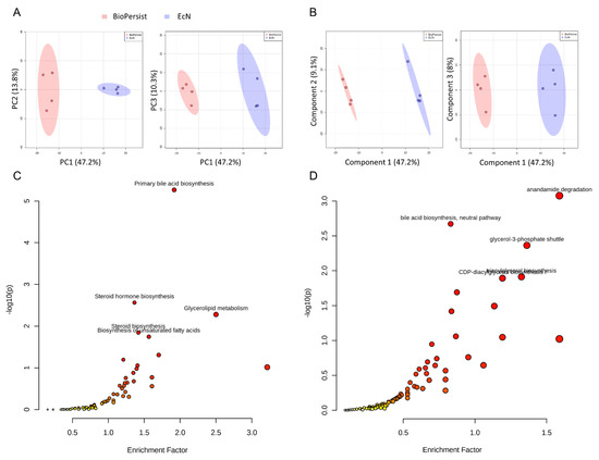 Signature pathways of mice treated with EcN and BioPersist. (A) PCA score plots with PC1 against PC2 and PC1 against PC3 for mice treated with EcN and BioPersist. (B) PLS-DA score plots with Component 1 against Component 2 and Component 1 against Component 3 for mice treated with EcN and BioPersist. (C) Significant pathways annotated with mouse KEGG and (D) BioCyc. n = 4 for each group.