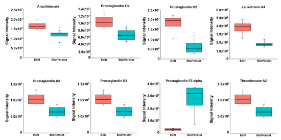 BioPersist reduces the production of pro-inflammatory prostaglandins. Individual metabolites involved in the prostaglandin biosynthesis pathway. n = 4 per group. * p < 0.05.
