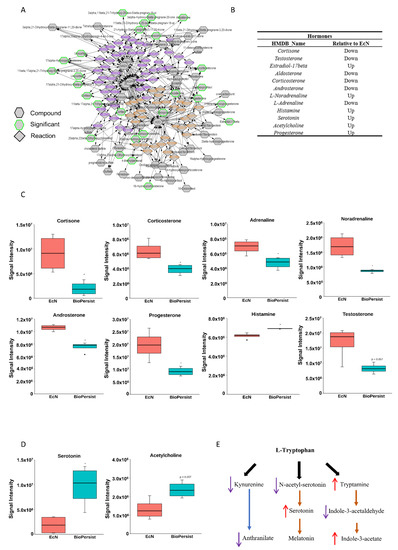 As demonstrated in Figure 4A, several major steroid hormones including the intermediate products were altered with the treatment of EcN compared to BioPersist when the subnetwork was built referencing C21 steroid hormone biosynthesis and metabolism. Compared to the mice treated with EcN, BioPersist reduced the levels of major stress hormones, including cortisone, corticosterone, androsterone, L-adrenaline, and aldosterone (Figure 4B,C). Taken together, not only major steroid hormones were altered with the treatment of BioPersist but also their intermediate metabolites involved in the same pathway. This revealed that BioPersist exhibited a global effect on the steroid biosynthesis pathway. Aldosterone regulates water and salt retention in the kidney [38], which is upregulated with the increased production of reactive oxygen species and inflammation [39]. Similarly, androsterone is one of the downstream metabolites of testosterone, which is shown to be elevated under stress, such as brain injury [40]. The other three major stress hormones, cortisone [41], corticosterone [42], and adrenaline [43], are well-known to increase blood flow and muscle contraction towards the brain, indicating an amplified and accelerated communication between intestine and brain [44]. On the contrary, anti-stress and anti-depressant hormones and neurotransmitters were increased in mice treated with BioPersist, such as acetylcholine and serotonin (Figure 4D). In addition, the steroid hormone biosynthesis pathway relates to many other upstream and downstream pathways including androgen and estrogen biosynthesis and metabolism, squalene and cholesterol biosynthesis, histamine metabolism, and bile acid metabolism. Hence, these pathways were selected to observe the correlation among the metabolites (Figure S7). The correlation analyses indicated statistically significant correlations between estrone and carnosine, and among urocanate, L-histidine, and 4-imidazolone-5-propanoate (Figure S7). Histamine metabolism, along with the altered hormones, indicated a linear regulatory relationship between intestine and brain. A number of studies have reported the importance of the gut–brain axis, focusing on the interaction of bi-directional communication between the central and the enteric nervous systems [44]. This interaction highlights the mutual regulation of gut microbiota and the cognitive center of the brain through the alteration of hormonal, immune, and neural responses.