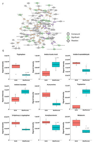 BioPersist decreases production or stress hormones and increases tryptophan derived anti-stress hormones. (A) Subnetwork of C21-steroid hormone biosynthesis and metabolism pathway. Metabolites highlighted in green indicated statistically significant features. (B) Summary of differential expressions of hormones between mice treated with EcN and BioPersist. (C) Concentrations of major stress hormones including cortisone, corticosterone, noradrenaline, adrenaline, aldosterone, testosterone, androsterone, and histamine in mice treated with EcN and BioPersist. (D) Serotonin and acetylcholine concentration in mice treated with EcN and BioPersist. (E) Schematic summary of three major tryptophan-derived pathways. (F) Subnetwork of the tryptophan metabolism pathway. Metabolites highlighted in green indicated statistically significant features. (G) Individual metabolites involved in tryptophan degradation pathways. n = 4 per group. * p < 0.05.