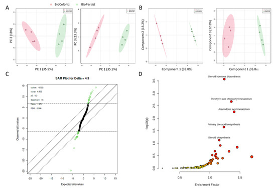 Signature pathways in mice treated with BioColoniz and BioPersist. (A) PCA score plots with PC1 against PC2 and PC1 against PC3 for mice treated with BioColoniz and BioPersist. (B) PLS-DA score plots with PC1 against PC2 and PC1 against PC3 for mice treated with BioColoniz and BioPersist. (C) Significant pathways annotated with the mouse KEGG database. n = 4 per group. (D) Significance analysis of microarray (SAM) analysis identified 46 significant features of the two probiotics.