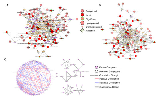- Gao, J.; Tarcea, V.G.; Karnovsky, A.; Mirel, B.R.; Weymouth, T.E.; Beecher, C.W.; Cavalcoli, J.D.; Athey, B.D.; Omenn, G.S.; Burant, C.F.; et al. Metscape: A Cytoscape plug-in for visualizing and interpreting metabolomic data in the context of human metabolic networks. Bioinformatics 2010, 26, 971–973. [Google Scholar] [CrossRef]