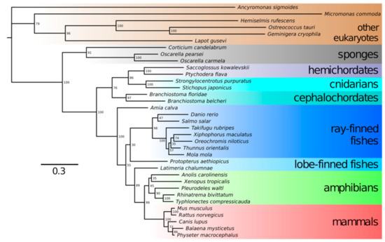 The transformation of Neu5Ac into Neu5Gc occurs by hydroxylation of the methyl group in the acetyl moiety. This reaction is catalyzed by cytidine monophosphate-N-acetylneuraminic acid hydroxylase (CMAH) [24]. The CMAH gene was reported to be present in chordates, including lancelets, tunicates, reptiles and amphibians; most fish and a number of mammals but, also, in algae and bacteria [2]. Only a few deuterostome lineages do not have a functional CMAH gene: among mammals, the CMAH gene is nonfunctional in humans, New World monkeys, the European hedgehog, musteloids, several bats, the sperm whale, white-tailed deer and the platypus. Thus, these organisms cannot synthesize Neu5Gc, which may influence their susceptibility to parasites. According to previous analyses [2,25], CMAH was acquired by a deuterostome via lateral gene transfer from a microalga. Notwithstanding the question of deuterostome monophyly [26], we performed BLAST searches using an extensive database of eukaryotic protein sequences and recovered a full sequence of putatively functional CMAH from a sponge Oscarella pearsei and partial sequences from sponges Oscarella carmela and Corticium candelabrum. All of these sponges belong in the class Homoscleromorpha; no CMAH sequences were detected in any of the three other sponge classes. Phylogenetic trees prepared in IQTree 2 using representative animal and nonanimal CMAH protein sequences showed that sponge CMAH belonged within a sister group to other animal CMAH sequences, while nonanimal CMAH sequences were basal to them (Figure 2). The placement of sponge CMAH within this sister clade had full bootstrap support. It follows that the alga-to-deuterostome transfer hypothesis should probably be revised; the gene seems to have appeared in animals earlier. We did not detect CMAH in any choanoflagellates (the sister group to animals) or other nonanimal holozoan species but only in protists even less closely related to animals (Figure 2). If we assume sponges are the earliest known branch of animals [27], CMAH might have been one of the genetic novelties present in the lineage that led to animals, present in the last common ancestor of animals but not in the (earlier) last unicellular ancestor of animals [28]. We posit that Neu5Gc presence might have shaped the relationships between animals and their pathogens since the Metazoa kingdom evolved.
