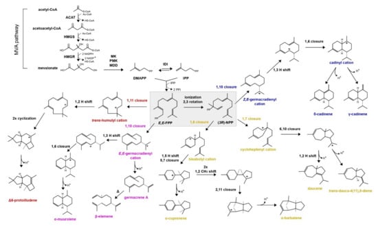 - Johnson, S.R.; Bhat, W.W.; Sadre, R.; Miller, G.P.; Garcia, A.S.; Hamberger, B. Promiscuous terpene synthases from Prunella vulgaris highlight the importance of substrate and compartment switching in terpene synthase evolution. New Phytol. 2019, 223, 323–335. [Google Scholar] [CrossRef]