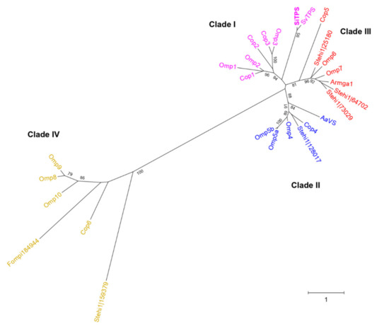 Phylogenetic analysis of selected functionally characterized basidiomycete STSs, Cop1-6 [4,6] from Coprinopsis cinerea, Omp1-10 from Omphalotus olearius, Fompi|84944 from Fomitopsis pinicola [3], Stehi1|159379, 128017, 25180, 64702, 73029 [8,12] from Stereum hirsutum, ArmGa1 [13] from Armillaria gallica, AaVS [14] from Cyclocybe aegerita (syn. Agrocybe aegerita), SiTPS from Serendipita indica and the SvTPS (NCBI accession number: PVF97777.1) from Serendipita vermifera were included in the analysis. A maximum-likelihood tree shows the 4 different STS clades formed, described also in [3,15] and Figure 1. The enzymes falling in one clade are considered to catalyze the first cyclization of the substrate in the same specific way; STS Clade I catalyze 1,10 cyclization of E,E-FPP (pink); Clade II, 1,10 cyclization of (3R)-NPP (blue); Clade III, 1,11 cyclization of E,E-FPP (red); Clade IV, 1,6 or 1,7 cyclization of (3R)-NPP (yellow). SiTPS is found in Clade I. The scale bar indicates a genetic distance of 1 and the bootstrap values are shown below the branches.