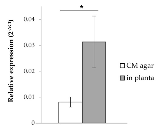 Relative expression of SiTPS when S. indica is grown for 14 days on complete medium (CM) agar plates compared to S. indica colonizing tomato roots (11 days post inoculation, dpi). Relative expression under both conditions was normalized using SiGAPDH (GenBank: FJ810523.1) expression levels and calculated with the 2−ΔCt method [39,40]. Error bars represent the standard error of the mean (n = 4). The asterisk (*) indicates a significant difference between the two conditions (t-test in R-studio, * p ≤ 0.05).