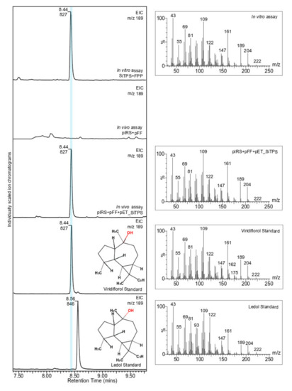 In vivo and in vitro characterization of SiTPS. GC-MS of hexane extracts from the in vitro assay in which the purified SiTPS was incubated with the substrate FPP (E,E-FPP) and from the in vivo assay with E. coli strains transformed with the plasmids pIRS, pFF and pET_SiTPS. An E. coli strain carrying only the pIRS and pFF plasmids was used as control. Analytical standards of viridiflorol and ledol were used to identify the produced compound. The mass spectra of the produced compounds and the analytical standards are given in the right hand panels.
