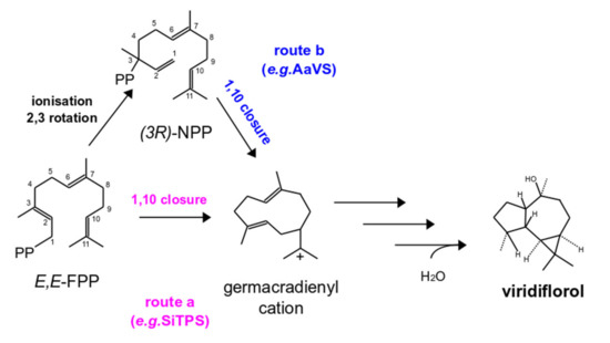 Proposed biosynthetic pathway leading to the production of viridiflorol. Viridiflorol biosynthesis starts with a 1,10-closure of either E,E-FPP (route a-Clade I, e.g., SiTPS) or (3R)-NPP (route b-Clade II, e.g., AaVS) to form a germacradienyl cation (E,E or Z,E, respectively). Two cyclization events (e.g., 1,11 and 2,6 closure) and additional reactions (e.g., addition of a molecule of water) result to formation of viridiflorol.