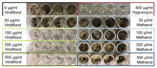 Microtiter plate wells containing PDB supplemented with viridiflorol, methanol or hygromycin and inoculated with 4000 spores of C. truncatum. Each treatment was performed in four replicates.