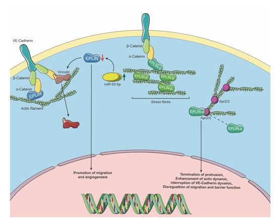 EPLIN was first observed when looking at differential expression between cancer and normal cells [,]. It had been largely investigated regarding its cellular function and interacting/regulatory partners, mainly in epithelial-derived cancer cells, leading to its labelling as a tumour suppressor. Angiogenesis is essential in cancer development and progression, for its role in blood, nutrient and oxygen supply and for acting as an escape route for disseminating cancer cells []. However, EPLIN’s role in angiogenesis was not in the spotlight in early studies. EPLIN bundles actin filaments and connects to the cadherin–catenin complex via α-catenin. It inhibits branch nucleation through Arp2/3 contributing to sustaining the cytoskeleton and cell–cell adhesion in epithelial cells [,]. Similar cell junction activities in endothelial cells, which regulate endothelium integrity, are crucial for angiogenesis [,]. Through overexpression of EPLIN-α in human endothelial HECV cells and conducting wound-healing and Matrigel adhesion assays, Sanders et al. reported that migration and adhesive ability were significantly downregulated when compared to control groups. Furthermore, the impact of EPLIN-α overexpression in HECV cells was also tested, using tubule formation assays and through the co-injection of either overexpressed EPLIN-α or plasmid control HECV cells with MDA-MB-231 cells in mice, demonstrating a role in inhibiting tubulelike structure formation in in vitro and in vivo tumour development []. Hence, EPLIN has the potential to affect angiogenesis, with a number of studies focused on EPLIN’s role and mechanism in endothelial cells and angiogenesis.