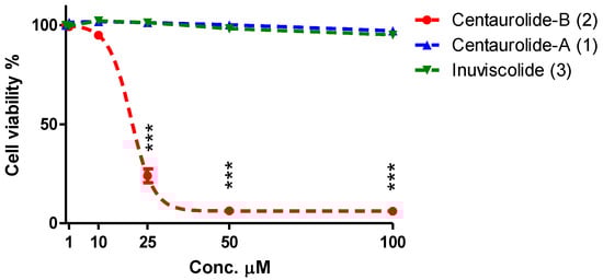 Effect of centaurolide-A (1), -B (2) and inuviscolide (3) on cell viability in human cervix adenocarcinoma cells (HeLa cells). Hela cells were treated with various concentrations (1, 10, 25, 50, 100 μM) of centaurolide-A (1), centaurolide-B (2), and inuviscolide (3), for 24 h and then cell viability was determined by SRB assay. Data has been plotted with non-linear regression. Different data points represent mean ± standard error (SE) of three independent experiments (n = 3); *** p < 0.001 compared to the corresponding vehicle. Statistical analysis was carried out using one-way ANOVA followed by Bonferroni as post hoc test.