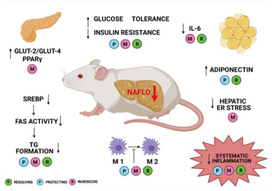 In vitro studies revealed that RvD1 reduced apoptosis and tunicamycin-induced TAG accumulation through c-Jun N-terminal kinase (JNK) pathway in HepG2 cells. Furthermore, the resolvin significantly decreased TAG accumulation and SREBP-1 expression []. Animal studies proved that resolvins have a great influence on NAFLD course. Rodriguez et al. showed that RvE1 (administered in a regimen of 100 ng/body weight, twice weekly for four weeks) suppressed fibrosis in Sprague–Dawley rats, which received diethylnitrosamine (70 mg/mg body weight intraperitoneally) once a week. RvE1 intake normalized albumin, ALT, and lactate dehydrogenase (LDH) levels and decreased the histological distortion, inflammatory infiltration, necrotic areas, and microsteatosis []. González-Périz conducted research, in which n-3 PUFA was administered to ob/ob mice, being an animal model of fatty liver disease. The results proved that the expression of genes involved in insulin and glucose metabolism (namely PPARγ and GLUT-2/GLUT-4) and insulin receptor (IRS-1/IRS-2) were up-regulated. Further analysis showed that PUFA metabolites decreased the formation of pro-inflammatory eicosanoids originated from n-6 PUFA and enhanced the formation of resolvins and protectins. Furthermore, RvE1 and PD1 limited the insulin-sensitizing effects and increased adiponectin expression similarly to rosiglitazone (antidiabetic drugs) []. Rius et al. tested the ability of RvD1 to improve the metabolic parameters initiated by caloric restriction in obese mice with non-alcoholic steatohepatitis (NASH). In order to reduce body weight and fat content, mice underwent 40% calorie restriction diet and were administered with RvD1 (300 ng/day) or placebo. In mice administered with the intervention product, adiponectin expression at mRNA and protein levels increased and liver macrophage infiltration was inhibited. Moreover, RvD1 induced macrophages’ transformation from M1- to M2-like anti-inflammatory phenotype and initiated macrophage immune response. In the liver tissue, the resolving supply decreased hypoxia-induced expression of COX-2, IL-1β and IL-6 []. Similar results were provided by Hellmann et al., who evaluated whether RvD1 (2 μg/kg) administration improves insulin sensitivity by diminishing chronic inflammation associated with obesity. The study results provided evidence that RvD1 improved blood fasting glucose, increased adiponectin production and simultaneously decreased the expression of IL-6 in adipose tissue. Moreover, macrophages’ F4/80 + CD11c + structure formation was reduced by >50% in adipose tissue []. Pal et al. investigated the effects of 4-day RvE1 administration in C57BL/6J mice and found that such intervention diminished hyperinsulinemia and hyperglycemia [].