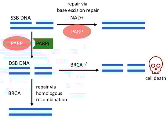 SSBs occur endogenously [20] and can evolve into double-strand breaks (DSBs) during DNA replication, which is the most deleterious DNA insult. In turn, DSBs are repaired by a complex network of proteins that belong to HR. BRCA1 and BRCA2 work at different stages of HR [15] and are required for a fool-proof repair of DNA DSBs through the HR pathway [12]. BRCA1 is a protein that functions in both checkpoint activation and DNA repair. Differently, BRCA2 mediates the core mechanism of HR [21]. HR happens during the S and G2 phases of the cell cycle due to the requirement for a sister template to promote DSB repair [22]. If there is a deleterious mutation of the BRCA1/2 genes, DSB will be fixed by the nonhomologous end-joining (NHEJ) pathway, which is an error-prone pathway. Therefore, BRCA1/2 mutated cancer cells are heavily reliant on a DDR repair pathway that will promptly fix SSBs before they become the deleterious DSBs [18]. Conversely, if PARP activity is inhibited in BRCA-deficient cancer cells, genomic aberrations accumulate beyond a bearable threshold and cause cancer cells to die by synthetic lethality, as depicted in Figure 1 [6,7,23].