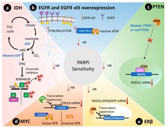 BRCAness phenotype in GBM that leads to impairment of the homologous recombination repair (HR) and PARPi sensitivity. (a) The mutated isocitrate dehydrogenase (IDH) enzyme results in the newly acquired ability to produce the oncometabolite 2-hydroxyglutarate (2HG) that inhibits lysine-specific demethylase 4A/B (KDM4A/B), which removes methyl (Me) groups from histones (H). In turn, the methylated histones will hinder the interaction of P53 binding protein 1 (53BP1) with double-strand breaks (DSB) and HR repair. (b) The overexpression of epidermal growth factor receptor (EGFR) or the constitutively active EGFR variant III (EGFR vIII) will lead to activation of the PI3K/Akt/mTOR pathway and consequently the activation of DNA-dependent protein kinase catalytic subunit (DNA-PKcs) that will inactivate ATM through phosphorylation. (c) PTEN transported to the nucleus induces the transcription of RAD51, an important component of the HR. In GBMs where PTEN is mutated or null, the transcription of RAD51 is reduced, and the HR is impaired. (d) MYC protooncogene directly suppresses the expression of CDK18 through interaction with its promoter that is responsible for activating the ATR through phosphorylation. ATR is an important component of HR. (e) ERβ is a cytoplasmatic receptor that suppresses the transcription of different components of the HR, such as RAD51, ATM, and ATR. IDH: isocitrate dehydrogenase; TCA: tricarboxylic acid cycle; KG: alpha-ketoglutarate; 2HG: 2-hydroxyglutarate; KDM4A/B: lysine-specific demethylase 4A/B; H: histone; EGFR: epidermal growth factor receptor; EGFR vIII: EGFR variant III; DNA-PKcs: DNA-dependent protein kinase catalytic subunit; ATM: ataxia telangiectasia mutated; PTEN: phosphatase and tensin homolog; EF2: transcription factor 2; ATR: ataxia telangiectasia and Rad3-related; ERβ: estrogen receptor beta.