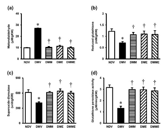 Effects of purple rice husk extract (PRHE) and metformin on renal oxidative stress indexes. (a) malondialdehyde; (b) reduced glutathione; (c) superoxide dismutase; (d) glutathione peroxidase. Values are the mean ± SD (n = 6). NDV: vehicle-treated normal group; DMV: vehicle-treated diabetic group; DMM: metformin-treated diabetic group; DME: PRHE-treated diabetic group; DMME: metformin plus PRHE-treated diabetic group; KW: kidney weight. * p < 0.05 vs. NDV, † p < 0.05 vs. DMV.