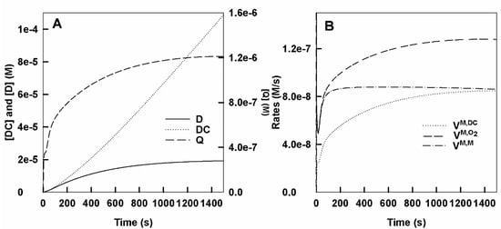 Rates of consumption of O2 and M are higher at the beginning of the reaction (Figure 1B), because in the native enzyme there is approximately 30% in the Eox form and this species consumes M and O2. The rate of DC accumulation increases with time, in the steady state:. However, the rate of O2 consumption () in the steady-state is 1.5 times or . The explanation for these curves is that at steady-state the enzyme molecule performs two cycles in the hydroxylase pathway (see Scheme 1) consuming 2M and 2O2 and one cycle in the oxidase pathway consuming 2D and 1O2. The two molecules of M originate 2Q and those of 2D other 2Q, which regenerate between 4Q, 2 of D and 2 of DC, for this reason, as shown in Figure 1B () [8,33]. Note a less abrupt drop in the rate of consumption of M and O2 and an increase in the rate of formation of DC (Figure S1B), because at t = 0 there is approximately a 30% enzyme in Eox form that reacts rapidly by consuming M and O2 and practically all the enzyme is found as EmM, that is, inactive, as will be seen later. The appearance of lag in the rate of DC formation can be observed.