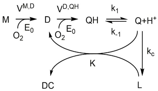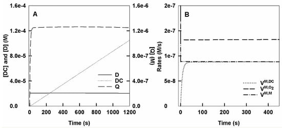 That is, the matter that enters the system is distributed among the different intermediaries and the final product. The intermediaries are D and o-QH, which reach steady-state with the levels and . An analytical expression can be established for the rate of M consumption and for the accumulation of DC.