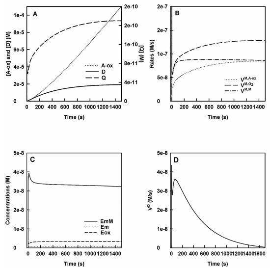 In this case, the arrival to the steady state is advanced and again it is true that the rate of formation of the colored adduct, the oxidized form of the adduct (A-ox) is related to the rate of consumption of M and O2 by the relationship and (Figure 3A,B). Evolution of D and the enzymatic species is shown in Figure 3C,D. Figure 3D shows the variation in the rate of accumulation of D over time. Initially there is a burst in the rate of formation of D, and then at long times decrease the rate until it vanishes in the steady state.
