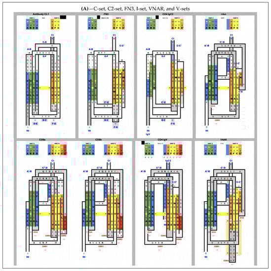 There are many papers reviewing differences between topological variants of the Ig domain [,] and a few hypotheses have been proposed on a divergent evolution scenario between them, with the IgC2 as the oldest one []. The I-set [,] is intriguing, as it is sometimes described as a V-set truncated on one side, missing the C′′ strand. The I-set is topologically and structurally similar to the VNAR domain, including on strands A/A’B-CC’ and DE-FG, with a very short C’ and, more surprisingly, with a matching C’-D linker, missing the CDR2 loop of IgVs. VNAR, however, is truly a variable domain with V(D)J recombination [,]. The four main classes of Ig domains, as well as VNAR and the FN3 domains, are shown in Figure 2 as topology/sequence maps that visualize topological/sequence alignments based on structure.