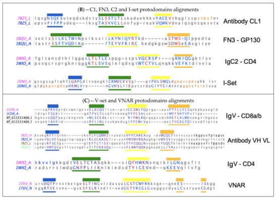 Sequence/topology maps comparison of topological variants of single Ig domains. (A) Sequence/topology maps: C1-set, C2-set, FN3, I-set, VNAR, and V-set for CD8a/CD8b and for CD4. See text for details on differences. Capital letters are used for structurally aligned residues. Colors are the same for matching strands in protodomains: blue for strands A and D, green for B and E (a full sheet ABED will read blue–green–green–blue), yellow for strands C and F, orange for strand C’ and G, and red for C” “IgV “linkers”. Colors green and yellow of central strands highlight the self-assembly of strand B-E and C-F of protodomains. FN3 and IgC2 have a similar topology, but FN3 does not share the CCW(L) present in all the selected Ig domains highlighted in central strands. Some IgV domains, such as CD2, however, can also miss that pattern (not shown). IgVs have a C” strand highlighted in red. We have highlighted CD8a and CD8b that form either homo- or heterodimers, with a split A/A’ strand where A’ swaps from one sheet, i.e., antiparallel to strand B and parallel to strand G, while CD4 IgV represents another type where the strand A is only on one sheet in parallel to strand G. VNAR shares the split strand A/A’ of IgVs, which is also present in the Ig-I set. The I-set is very similar to VNARs that have only a few more residues in their HV2 region that encompass a short C’ strand antiparallel to C, and a C’-D linker that is structurally superimposable in VNAR and I-set. In fact, the overall structural alignment is very good with an RMSD of 1.83A and a surprisingly good sequence match (https://structure.ncbi.nlm.nih.gov/icn3d/share.html?c8F4iowua2TAD6ej8, accessed on 27 August 2021) (B) Alignment of protodomains in C1-, C2- and I-set domains. Colors, as in A, show the corresponding strands aligning 3 out of 4 strands due to symmetry breaking (see text). In the I-set, the G strand is shown in orange, as well as that which would be C’ when comparing with IgVs, if it were not a protodomain “linker” in the I-set context. RMSD for protodomain alignments are for C1: 1.19 A, FN3: 1.8 A, C2: 1.98 A, I: 2.46 A (iCn3d self-alignment of 2DM3: https://structure.ncbi.nlm.nih.gov/icn3d/share.html?tBzknU8spazpwCup7, accessed on 27 August 2021) (C) Alignment of protodomains in IgVs and VNAR domains. The symmetry breaking (see text) also extends to CD4-like IgVs, where strand A is swapped in protodomain 1 vs. strand D in protodomain 2. In other IgVs, such as CD8 or antibody VH-VL domains that we added for completeness, or in VNAR, the strand A is split A/A’, as in the I-set, and keeps a symmetric correspondence with strand D, overall, in all 4 strands AB-CC’ vs. DE-FG, with only a partial symmetry breaking through strand A’. Protodomain alignments consistently show a structural match for conserved and co-evolved residues C in strand B and strand F vs. residues W and (most often) L in strand C and strand E, respectively. RMSD for alignments: for CD8a-IgVs, 1.61 A (CD8b sequences are indicated sequence by homology with mouse CD8b structure (2ATP) whose protodomains superimpose with and RMSD of 0.895 A and 1.54 A), followed by VH-VL protodomains for reference with an RMSD of 1.8, 0.882, and 1.74 A respectively; CD4-IgV protodomains, 1.84 A; VNAR protodomains, 2.31 A.