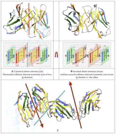 Let us briefly review the pseudosymmetric assembly of Ig domains. Twofold (C2) quaternary symmetry has been demonstrated in the very first structural studies on Ig domain dimers, especially of IgV domains [,,]. The IgV-IgV dimerization interface using the GFCC’ sheet was observed in the first Fab structure solved (PDBid: 7FAB) (https://www.ncbi.nlm.nih.gov/Structure/icn3d/full.html?&mmdbid=7fab&bu=1&showanno=1&source=full-feature, accessed on 27 August 2021) [] and can be considered canonical. It is also found in homodimers such as CD8aa (PDBid: 1CD8) (https://structure.ncbi.nlm.nih.gov/icn3d/share.html?JcP3sd1gGfqXEBEM8, accessed on 27 August 2021) [], and was in fact already observed in the Bence Jones protein, the very first structure deposited in the PDB (1REI) (https://www.ncbi.nlm.nih.gov/Structure/icn3d/full.html?&mmdbid=1rei&bu=1&showanno=1&source=full-feature, accessed on 27 August 2021) [], forming a VL-VL interface through that same GFCC’ sheet. In antibodies and antibody fragments such as Fabs or scFvs, pseudosymmetric interfaces are formed by a VH-VL domain pairing. Constant domains such as CH-CL, on the other hand, use the opposite sheet ABED of the Ig domain to dimerize. In some cases, VH domains can also pair through that ABED sheet, as in Fab-dimerized glycan-reactive antibodies [].