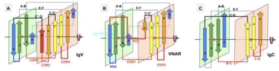 In VNAR domains, the heavy chain-only variable domain of sharks [,], the topology seems to be lying between the I-set and the V-set if one considers the similarity between the protodomain linkers, i.e., with the so-called HV2 region instead of the CDR2/C” region in IgVs, which can be considered to be composed of a very short C’ before the C’D linker straddling the D strand. The topological organization is similar to the I-set (Figure 2) and the C’D linker that even aligns structurally to C’D is usually considered part of the HV2 variable region in e VNARs. It is tempting to see an evolutionary relationship.