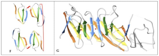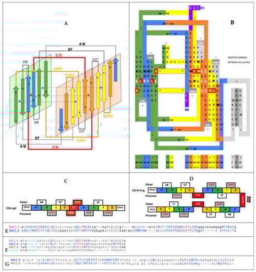 This whole C[c’c”d]E region distinguishes the various Ig domains. They can all be reconciled by understanding the linking of two protodomains: AB-C[C’–linker–D]E-FG, forming (or removing) strands, partially breaking the symmetry and leading to topological variants. For example, comparing the two protodomains in an I-set domain through self-alignment (https://structure.ncbi.nlm.nih.gov/icn3d/share.html?tBzknU8spazpwCup7, accessed on 27 August 2021) where the C’ strand that would match the G strand by symmetry in an IgV (shown in orange in Figure 2) morphs into a straddling linker between the two strand sheets, between strands C and D.