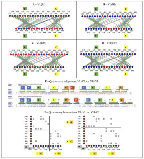 Interaction networks at the Ig protodomain core interface and quaternary Ig-Ig interface. Comparing protodomain interface BC/EF for (A) B38 Antibody VL domain (7BZ5) (B) B38 Antibody VH domain (C) Bence Jones (BJ) VL domain chainA (1REI) (D) Bence Jones (BJ) VL domain chainB (https://structure.ncbi.nlm.nih.gov/icn3d/share.html?i2HiYhm3e4P8ecby6, accessed on 27 August 2021)—residue node colors: red = conserved/blue = not conserved between antibody VH-VL B38 and Bence Jones protein dimer VL-VL. Line colors: interactions: grey = VdW contact; green = H-bond; cyan = charge–charge; red = charge–aromatic; blue = charge–aromatic. Cys bonds shown in grey. The interface exhibits a conserved pattern, including, in particular, the CCW residues. (E) Quaternary Alignment BJ VL-VL vs. B38 VH-VL: the VH-VL dimer (7BZ5) aligns with a VL-VL dimer (1REI) within 1.53 A RMSD over 202 residues with 57% sequence identity. (F) Quaternary interface of BJ homodimer VL-VL (left) vs. B38 heterodimer VH-VL (right) with contributions from protodomain 1 (CC’) and protodomain 2 (FG), forming the GFCC’ sheet (https://structure.ncbi.nlm.nih.gov/icn3d/share.html?aYHnSxgAD6kSoQqn8, accessed on 27 August 2021)—colors as in (E)—notice the symmetry in contacts in VL-VL (apart from a small experimental difference) vs. asymmetry in VH-VL, with a highly conserved Q38 vs. Q38/39 H-bonded interaction (green).