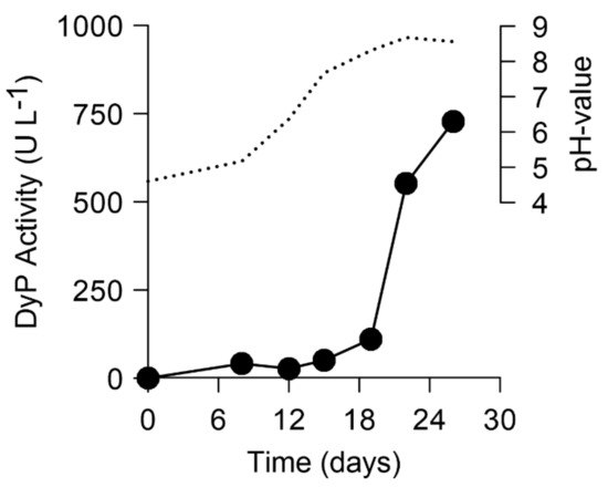 Time course of DyP production (black circles) by X. grammica in SPM medium; activity was measured with ABTS and H2O2, dotted lines—pH value.