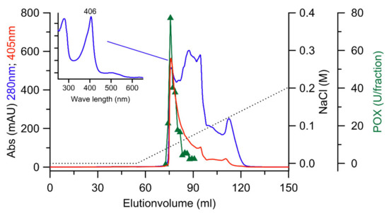 Small-scale production of MiP reached the highest levels of up to 750 U L−1 during growth in soy-peptone-based complex liquid media. Enzyme secretion was accompanied by alkalization of the medium from pH 5.0 on day 8 to 8.9 on day 20. In parallel, the MiP activity increased from 80 to 750 U L−1. (Figure 1). It should be noted that ‘true’ extracellular peroxidase activity (neither of DyP nor of any other heme peroxidase) has not yet been described for an ascomycetous fungus. Therefore, the X. grammica peroxidase (XgrDyP) was chosen for further studies regarding enzyme purification and characterization.