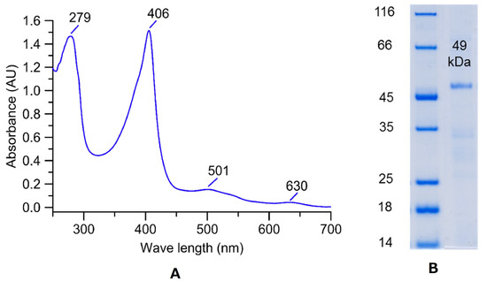 Purified XgrDyP exhibited the characteristic reddish color of heme-containing enzymes and had absorption maxima at 406, 501, and 630 nm (Figure 3A). The protein appeared as a single protein band with a molecular mass of 49 kDa in the SDS-PAGE gel indicating its pure nature (Figure 3B).
