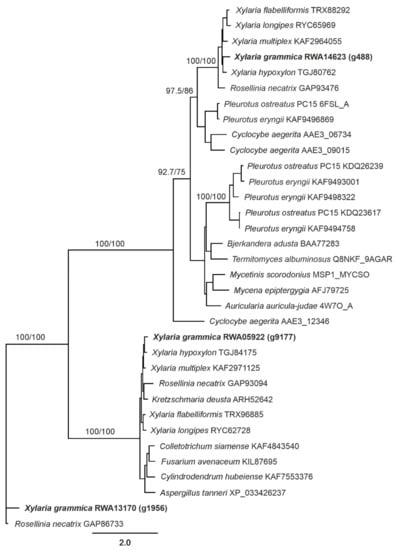 A custom blast search using reference sequences from B. adusta and Pseudomonas aeruginosa DyPs indicated the presence of three DyP-encoding genes (g488, g9177, and g1956) in the X. grammica genome (Figure 5).