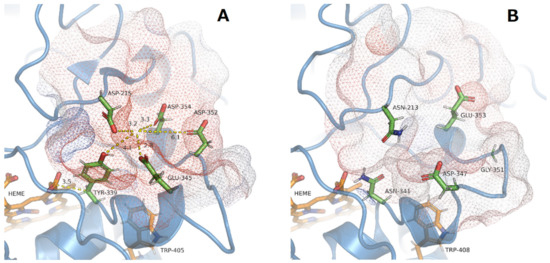Fueyo et al. [56] identified an Mn2+ binding site on the surface of rPosDyP4 based on mutation studies. This consists of the four acidic amino acids (Asp215, Asp352, Asp345, Glu354) and Tyr339. The enzyme obviously uses an electron transfer mechanism (‘electron hopping’) from the glutamate (Glu345) to the heme via an aromatic residue (Tyr339, Figure 6A; [56]). In the case of XgrDyP, no similar surface-exposed Mn2+ oxidation site could be identified within the structure model. In the corresponding region, only two rather distantly related acidic amino acids are present (Glu353 and Asp347). Their probably coordinating carboxylates do not show a distinct orientation towards the protein surface and no aromatic amino acid is available for an electron transfer towards the heme (Figure 6B).