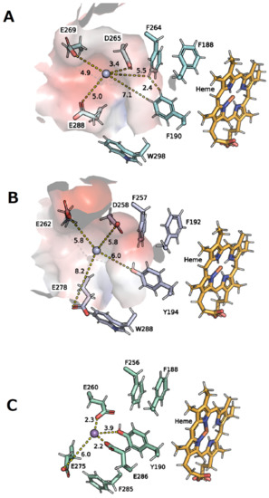 In the model structure of XgrDyP g488, a comparable region near the protein surface was detected. The Mn2+ ion could be coordinated by three acidic amino acids (Asp269 and 288, and Glu265; Figure 7A) and the oxidation may be supported by four aromatic amino acids (three Phe190, 264, and 188 and one Trp298), which act as partners for the electron transfer. The three Phe residues are in close proximity to each other (e.g., 2.4 Å between Phe264 and 190) as well as to the heme center, making them suitable for electron transport. This protein environment is rather similar to the Mn2+ binding site postulated for the bacterial AspDyP2. It is also interesting to note that the relevant acidic and aromatic amino acids are conserved in both bacterial and several fungal DyPs [56].